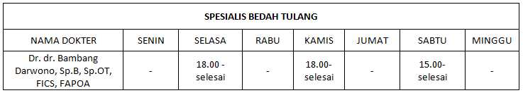Berikut kami informasikan jadwal praktik Dr. dr. Bambang Darwono, Sp.B, Sp.OT, FICS, FAPOA:
