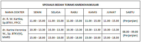 Dan untuk pendaftaran dr. Karina Veronica W., Sp. BTKV(K), MARS, Ibu dapat menghubungi Poliklinik Rawat jalan kami di nomor (021) 452 0201, 452 1001 ext. 28712, 28713.