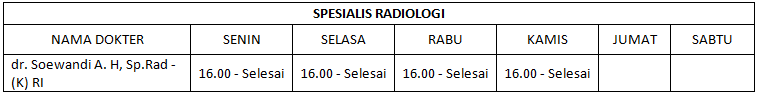 Adapun jadwal praktek dr. Soewandi A. H, Sp.Rad-(K)RI sebagai berikut:
