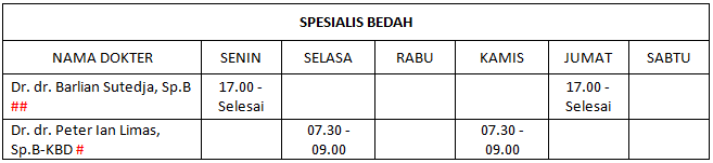- Dr. dr. Peter Ian Limas, Sp.B-KBD cuti sampai dengan pemberitahuan selanjutnya.