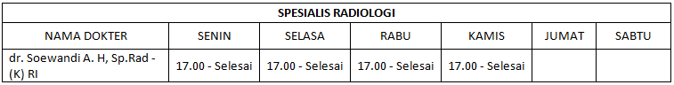 Adapun jadwal praktek dr. Soewandi A. H, Sp.Rad-(K)RI adalah sebagai berikut:
