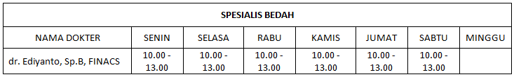Berikut kami informasikan jadwal praktek dr. Ediyanto, Sp.B, FINACS: