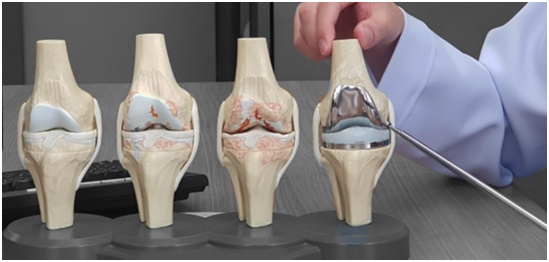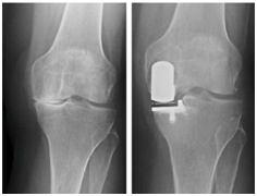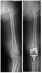 | Gambar 4: Perbandingan kondisi kerusakan sendi pada osteoarthritis (pengapuran) pada lutut. Pada pengapuran sendi yang berat dilakukan penggantian sendi untuk mengurangi nyeri dan koreksi deformitas. |