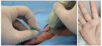 | Gambar 10: Operasi untuk membebaskan tendon yang terjerat pada jari tengah menggunakan percutaneus release dengan USG guide. Luka post operasi biasanya tidak memerlukan jahitan dan segera dapat digunakan. |