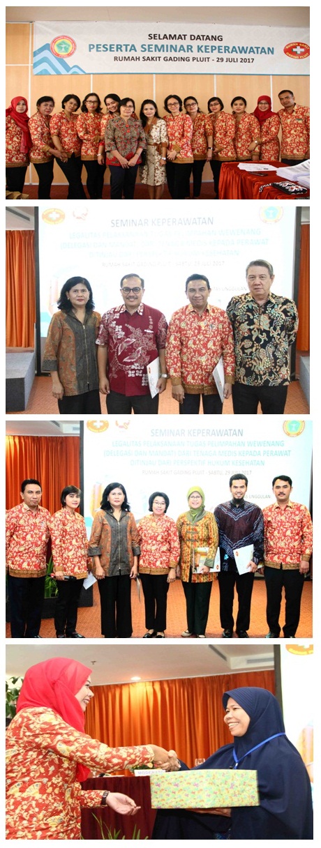 Jakarta – (03/08/17) : Pelayanan Keperawatan merupakan pelayanan profesional, sebagai bagian dari pelayanan kesehatan yang mempunyai daya tarik dalam peningkatan dan pengembangan bidang kesehatan. Kualitas pelayanan juga ditentukan oleh kualitas dan kecakapan perawat. Guna mewujudkan tenaga perawat yang berkualitas, pengembangan diri selalu dituntut di bidang keilmuan, ketrampilan dan etika. Di samping itu, para perawat juga harus memahami delegasi dan mandat yang diberikan kepada perawat. Terkait hal itu, PPNI Rumah Sakit GADING PLUIT mengajak sejawat perawat di seluruh Indonesia meningkatkan pengetahuan dan ketrampilan dalam pelimpahan delegasi dan mandat dengan menyelenggarakan Seminar Keperawatan dengan tema “Legalitas Pelaksanaan Tugas Pelimpahan Wewenang (Delegasi dan Mandat) Dari Tenaga Medis Perawat Ditinjau dari Perspektif Hukum Kesehatan” yang telah dilaksanakan pada hari Sabtu, 29 Juli 2017 pukul 08.00 - 17.00 WIB, bertempat di ruang Auditorium Rumah Sakit GADING PLUIT, dengan narasumber yaitu : dr. Djaja Surya Atmadja, DFM, SH, Sp. F, Ph.D , Ketua PPNI Pusat bapak Harif Fadhillah, SKp. SH, dr. Prayetni, S.Kp., M.Kep, dr. Rita Sekarsari, SKp. Sp.KV, MHSM. Kegiatan ini diawali dengan ceremonial pembukaan yang meliputi laporan ketua panitia Bapak Sutisna P., S.Kep, sambutan Kepala Bidang Keperawatan Rumah Sakit GADING PLUIT Ibu Celly M. Magdalena, SKM, MARS, dan Direktur Medis Rumah Sakit GADING PLUIT dr. Arief Oetama, MARS yang sekaligus membuka acara. JAYALAH SELALU PERAWAT INDONESIA .. !!! JJ – HMKT RSGP